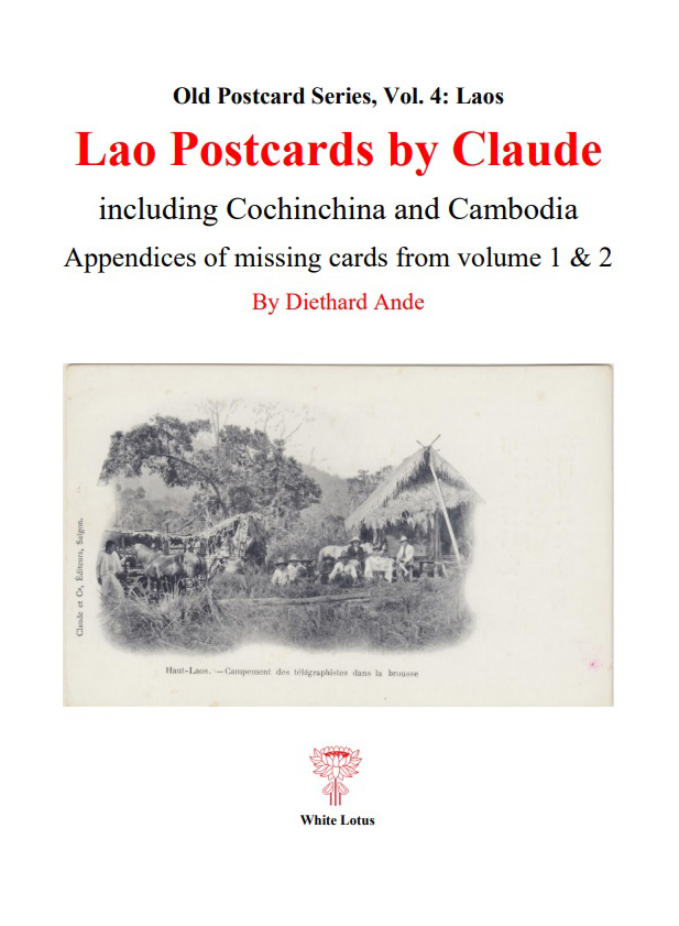 Lao Postcards by Claude is volume 4 of the Old Postcard Series on Laos. Claude and Cie was a publishing house in Saigon with postcard series on Laos, Cambodia, and Cochinchina. All their series are covered: