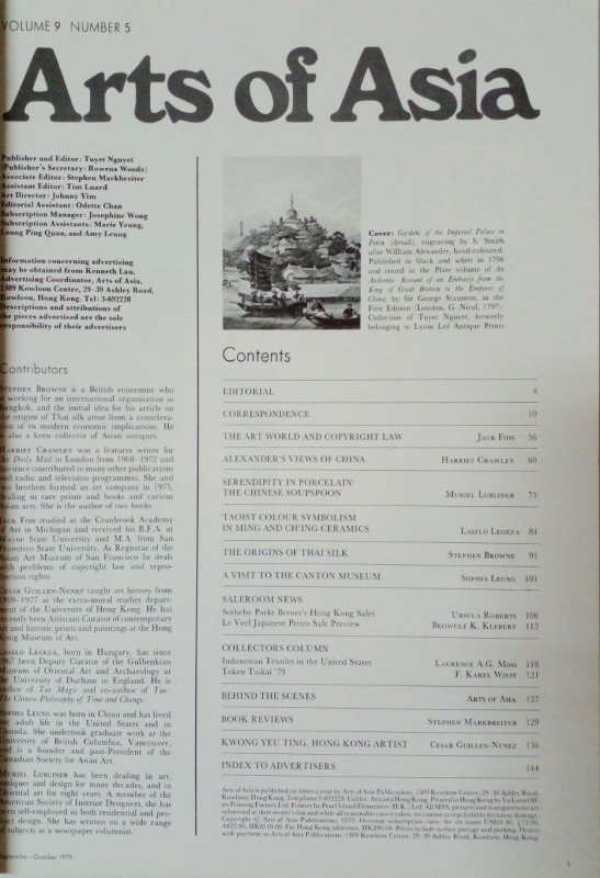 Serendipity in Porcelain: The Chinese Soupspoon, Taoist Colour Symbolism in Ming and Ch'ing Ceramics, The Origins of Thai Silk, article in Arts of Asia (Sep-Oct, 1979)