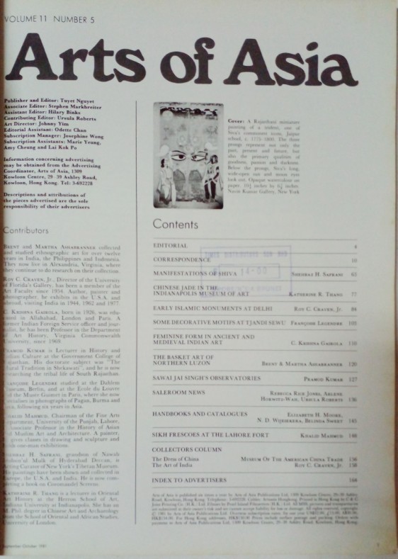 Chinese Jade in the Indianapolis Museum of Art, Early Islamic Monuments at Delhi, Feminine form in Ancient and Medieval indian Art, article in Arts of Asia (Sep.-Oct.'1981)